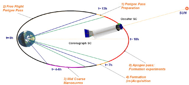 - Two satellites — Occulter Spacecraft (200 kg) and Coronagraph Spacecraft (340 kg) — mimic a natural solar eclipse.