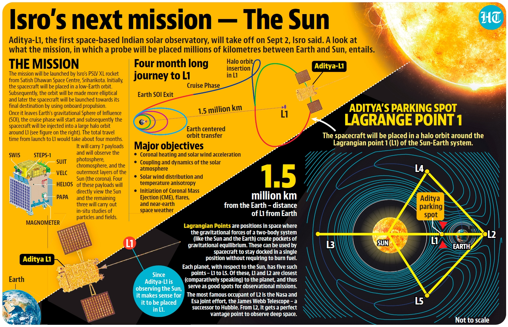 - Key Features:India’s first solar mission designed to study the Sun’s corona, photosphere, chromosphere, and solar wind.Positioned at the Lagrange Point 1 (L1), about 1.5 million km from Earth.Equipped with instruments like the Visible Emission Line Coronagraph (VELC) and Solar Ultraviolet Imaging Telescope (SUIT).