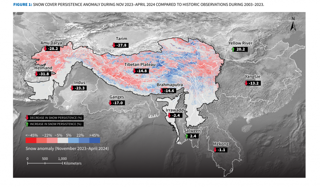 - The western part of the HKH region, which contributes the highest water supply to rivers, witnessed dramatically low snow levels.