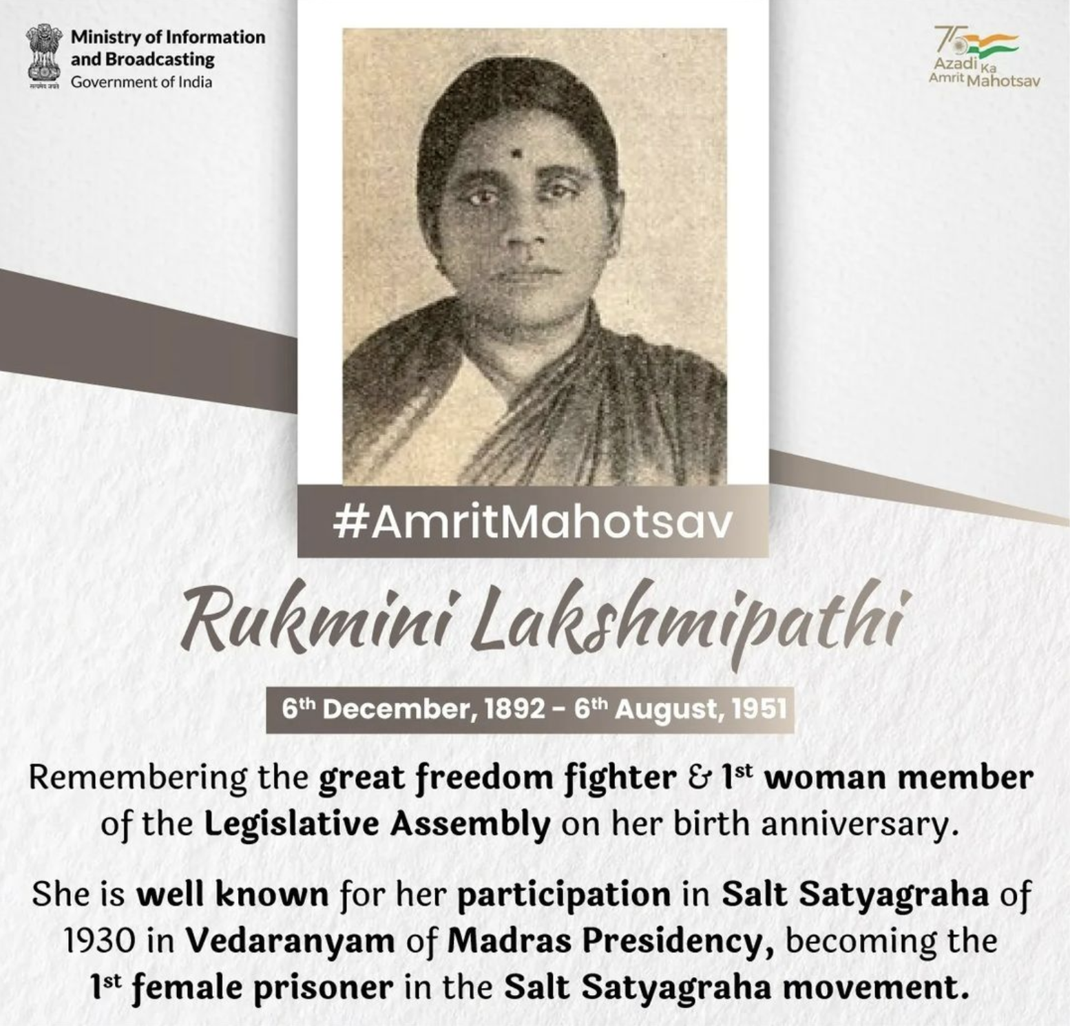 - She became the first woman member of the Legislative Assembly and was also elected to the Madras Legislative Council.