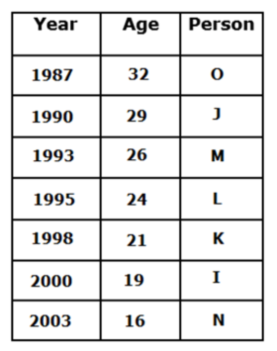 Eg. Seven persons are born in different years such as 1987, 1990, 1993, 1995, 1998, 2000 and 2003. All the person’s age are calculated by considering 2019 as the base year. Difference of age between I and J was same as between M and N. Both I and N are younger than M and J. I is not the youngest person of the group. Difference of age between I and J is 10 years. Difference between the ages of I and J is double the age difference of N and K. I was born in an even numbered year but younger than J who is elder than L. Age difference of N and K is equal to the difference of the age of L and J. L is younger than O but older than K.