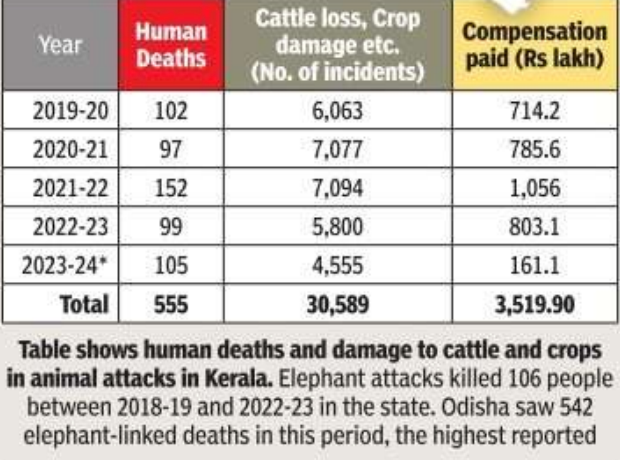 From 2011 to 2021 elephants have been responsible for 190 human deaths in Kerala. Elephants are also responsible for the deaths of cattle.