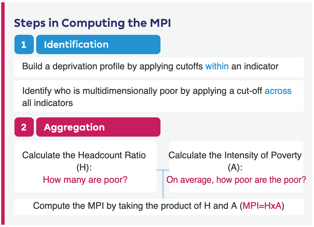 - Finally, the MPI is arrived at by multiplying the incidence of multidimensional poverty (H) and the intensity of poverty (A).