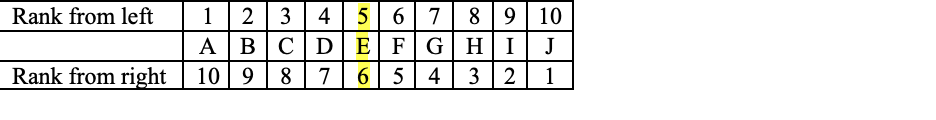 Rank of E from left is 5, rank from right is 6. Sum of left and right rank is 11. Total number of students are 10.
