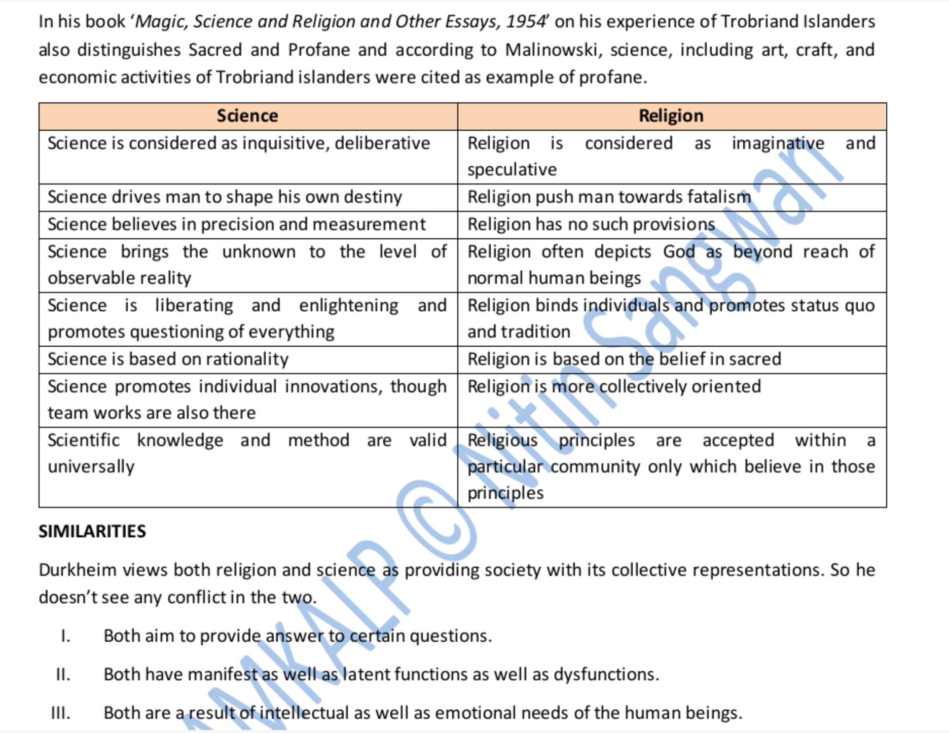 - Malinowski's theory of necessity of Religion when Scientific Rationality overrides human consciousness - Religion as an agent to reduce Alienation.