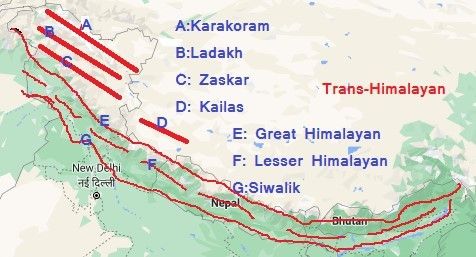 ○ Most of the Himalayan ranges fall in India, Nepal and Bhutan. The northern slopes are partly situated in Tibet (trans-Himalayas) while the western extremity lies in Pakistan, Afghanistan and Central Asia.