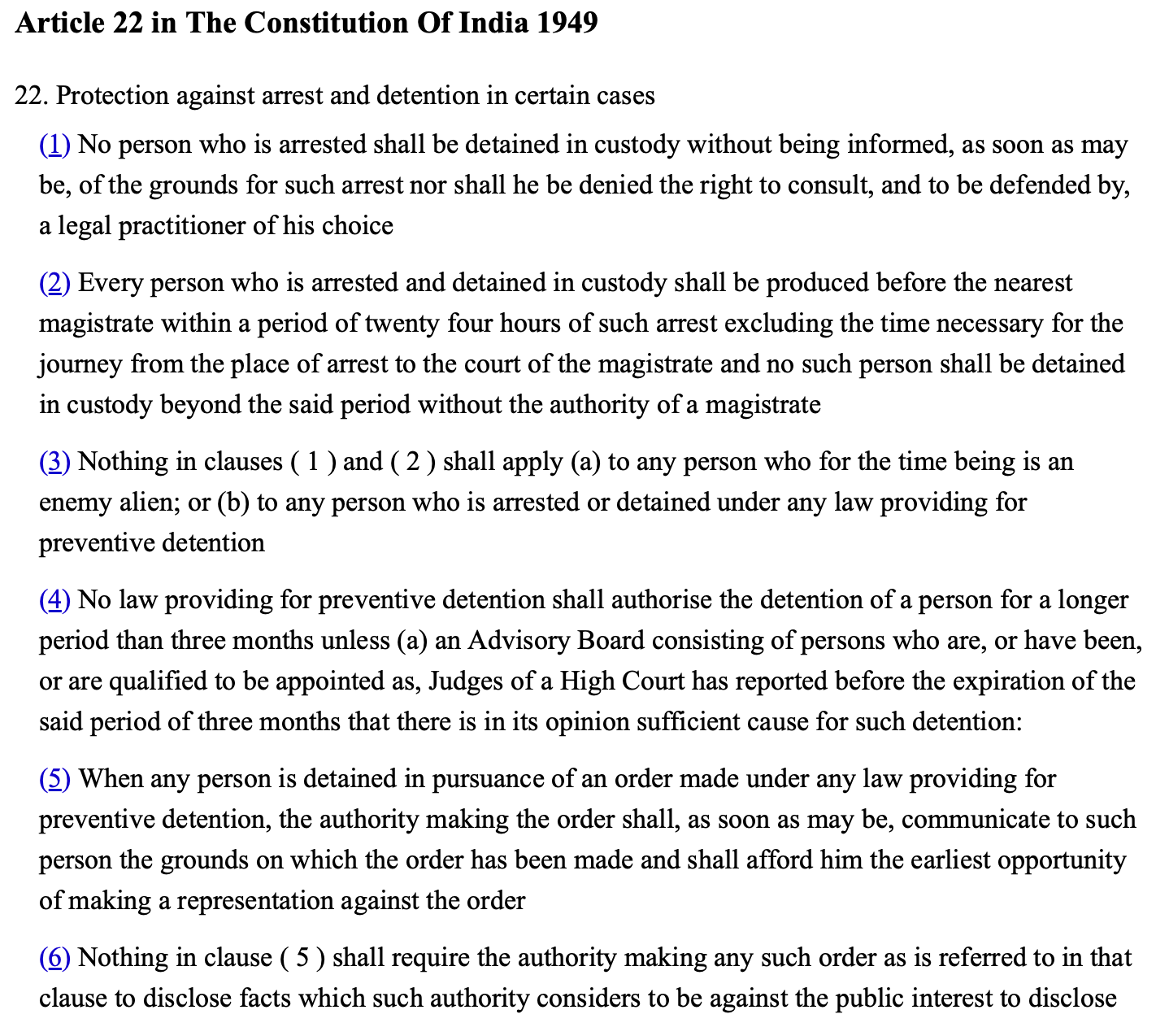 - The Constitution of India exempts the States from providing legal counsel to a person being held for preventive detention.