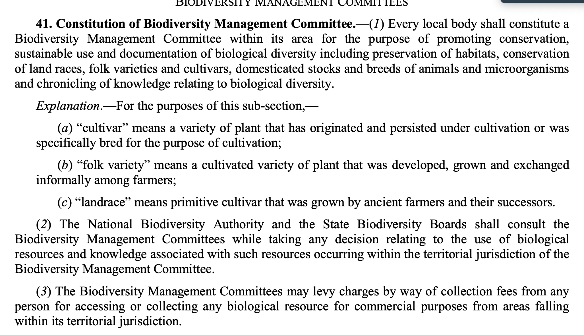 - The Biodiversity Management Committees have important functions in determining access and benefit sharing, including the power to levy collection fees on the access of biological resources within its jurisdiction.