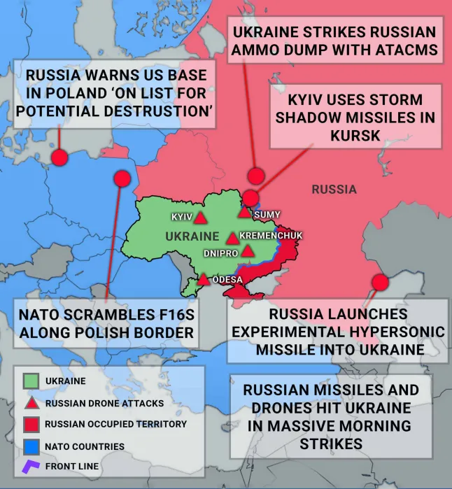 - Event: Russian President Vladimir Putin announced plans to continue deploying and mass-producing hypersonic missiles, posing a significant threat to Western nations. Russia launched "Oreshnik" ballistic missile at Ukraine.
